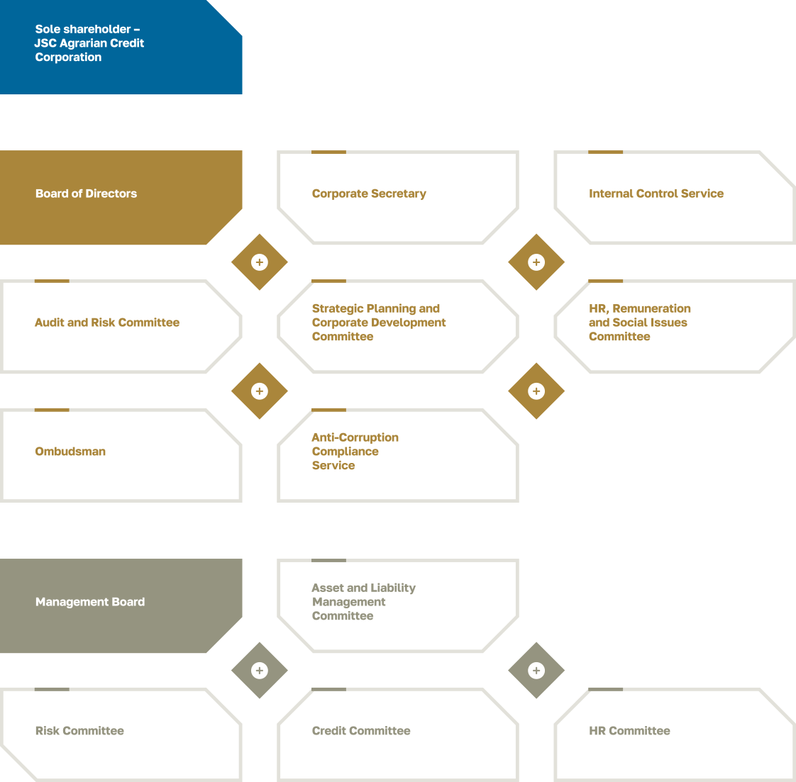 The highest body of KazAgroFinance is the Sole Shareholder, the management body is the Board of Directors, the executive body is the Management Board.