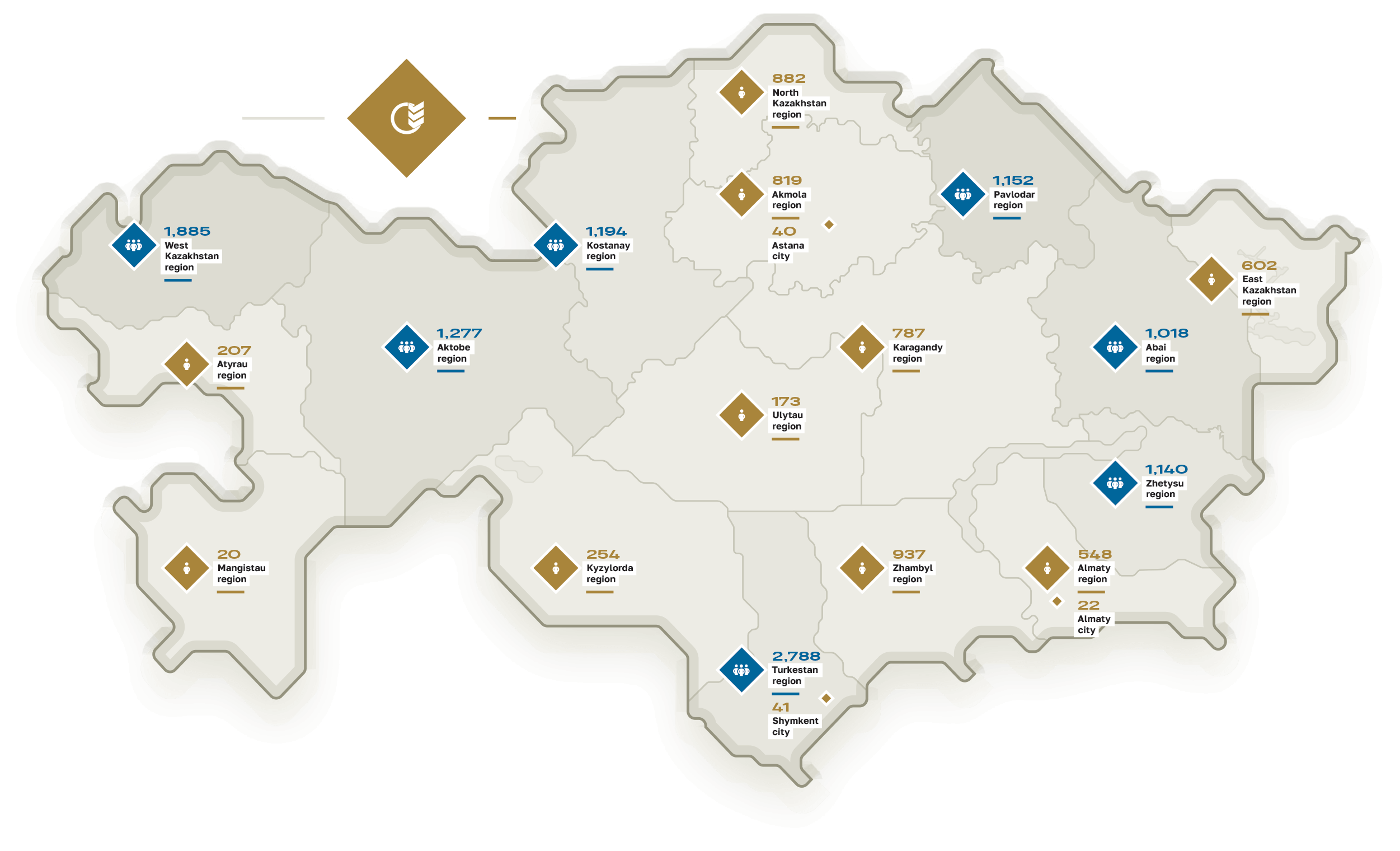 In the regional map of the Company’s clients, Turkestan, West Kazakhstan, Aktobe, Kostanay, Pavlodar, Zhetysu and Abay regions have more than a thousand clients.